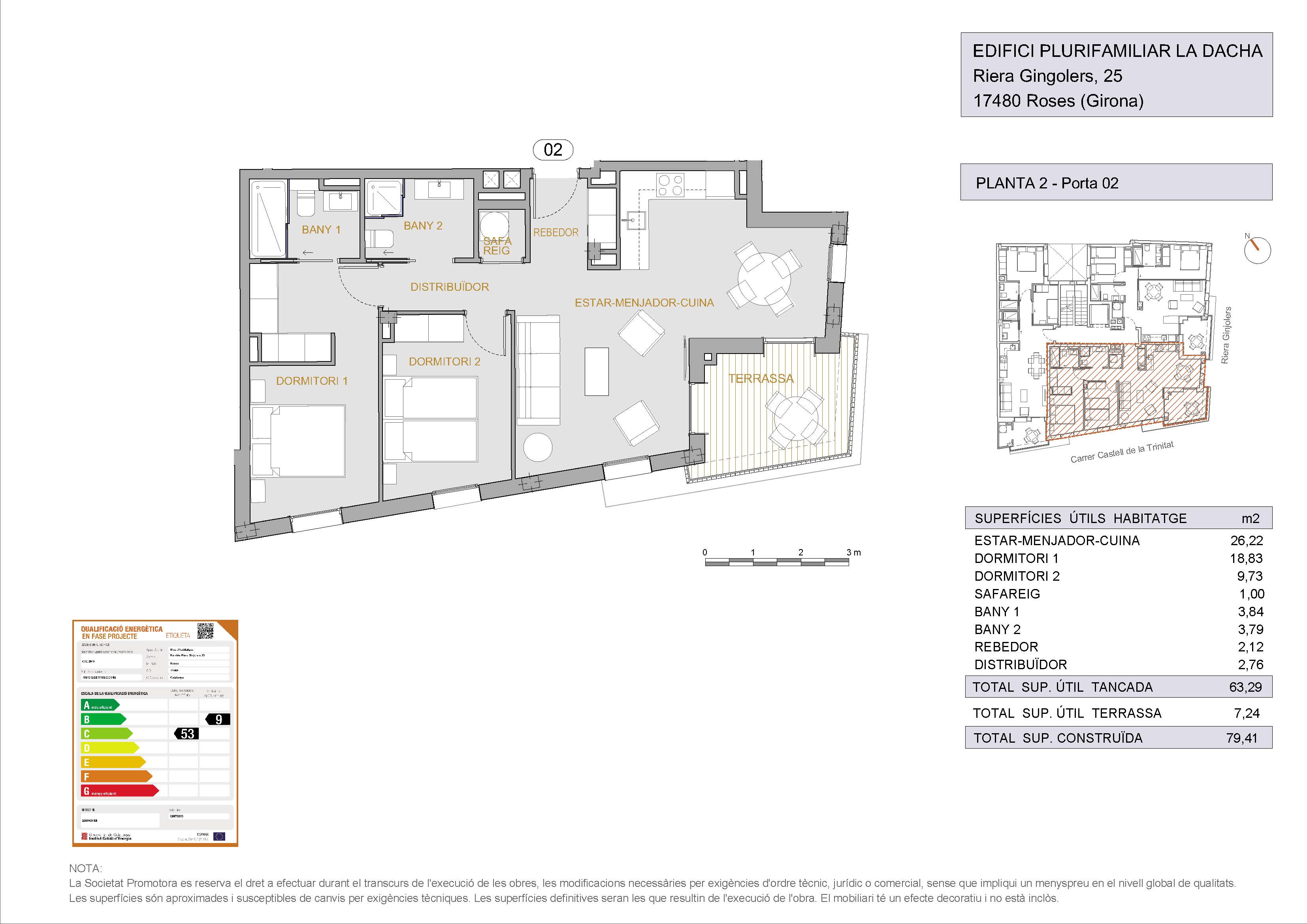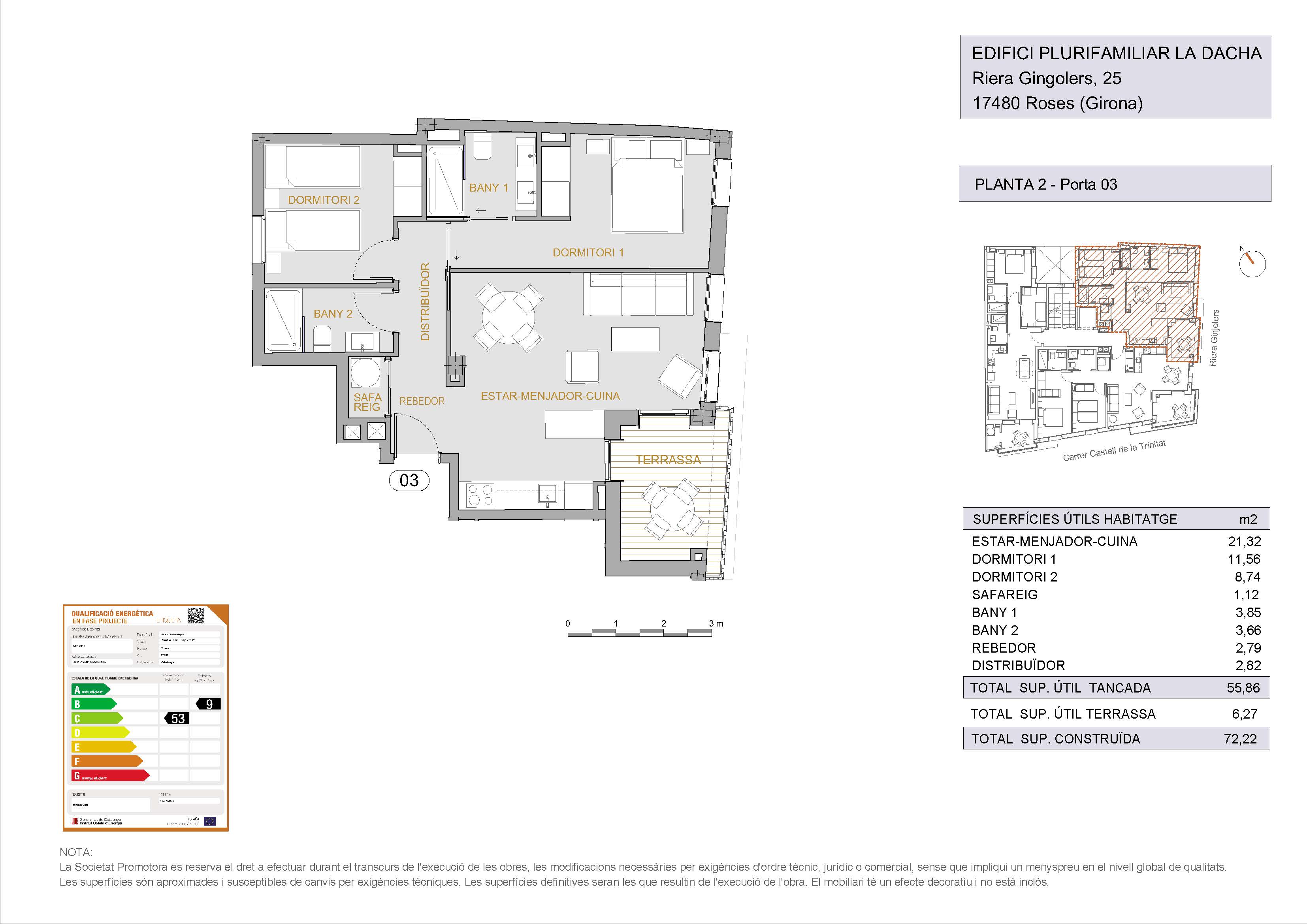 The apartments have a constructed area of 70.23 m2 and have 2 bedrooms, 2 full bathrooms, a terrace, laundry room and a large living room-kitchen