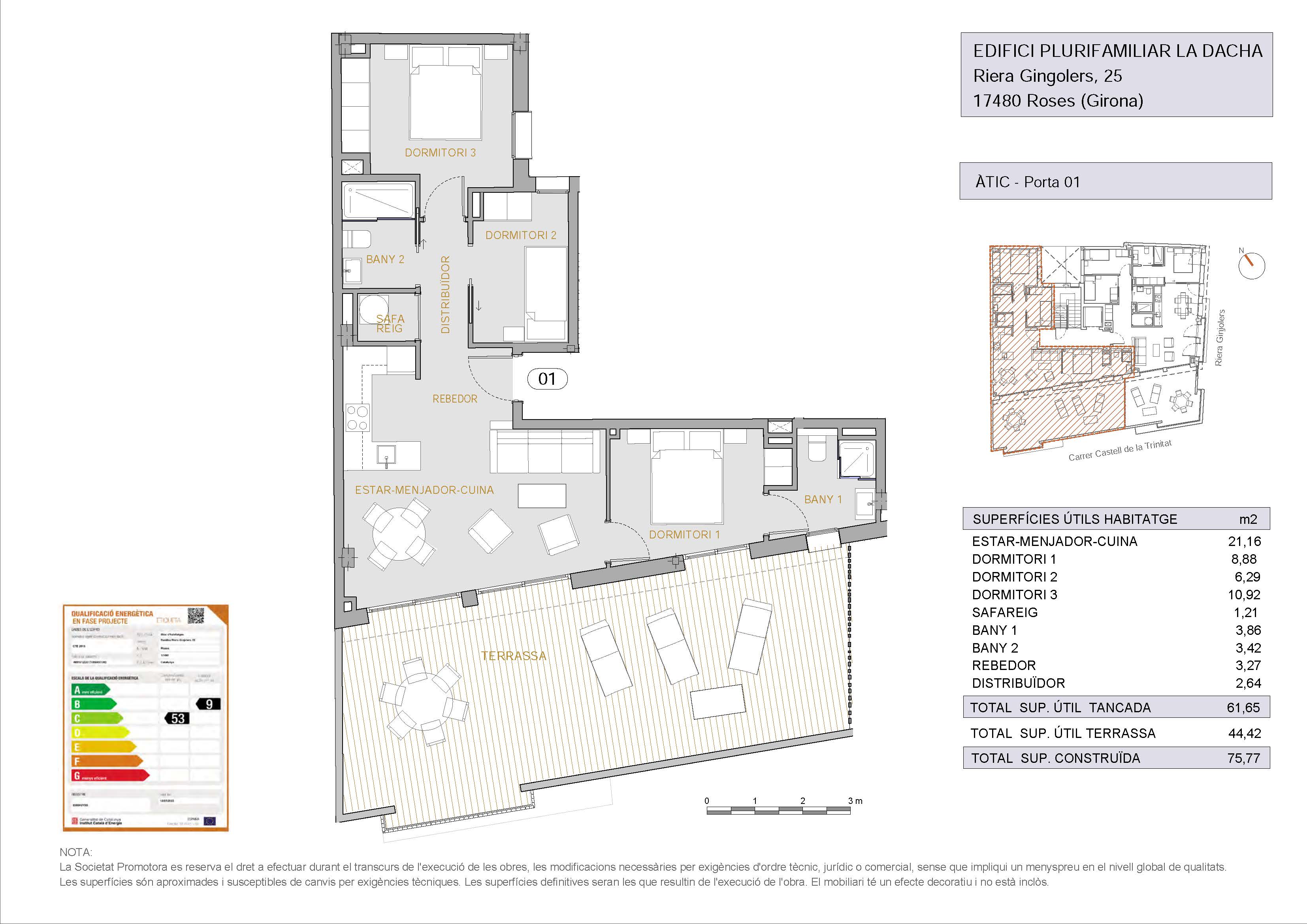 The penthouse has a constructed area of 75.77 m2 with 44.42 m2 of terrace.