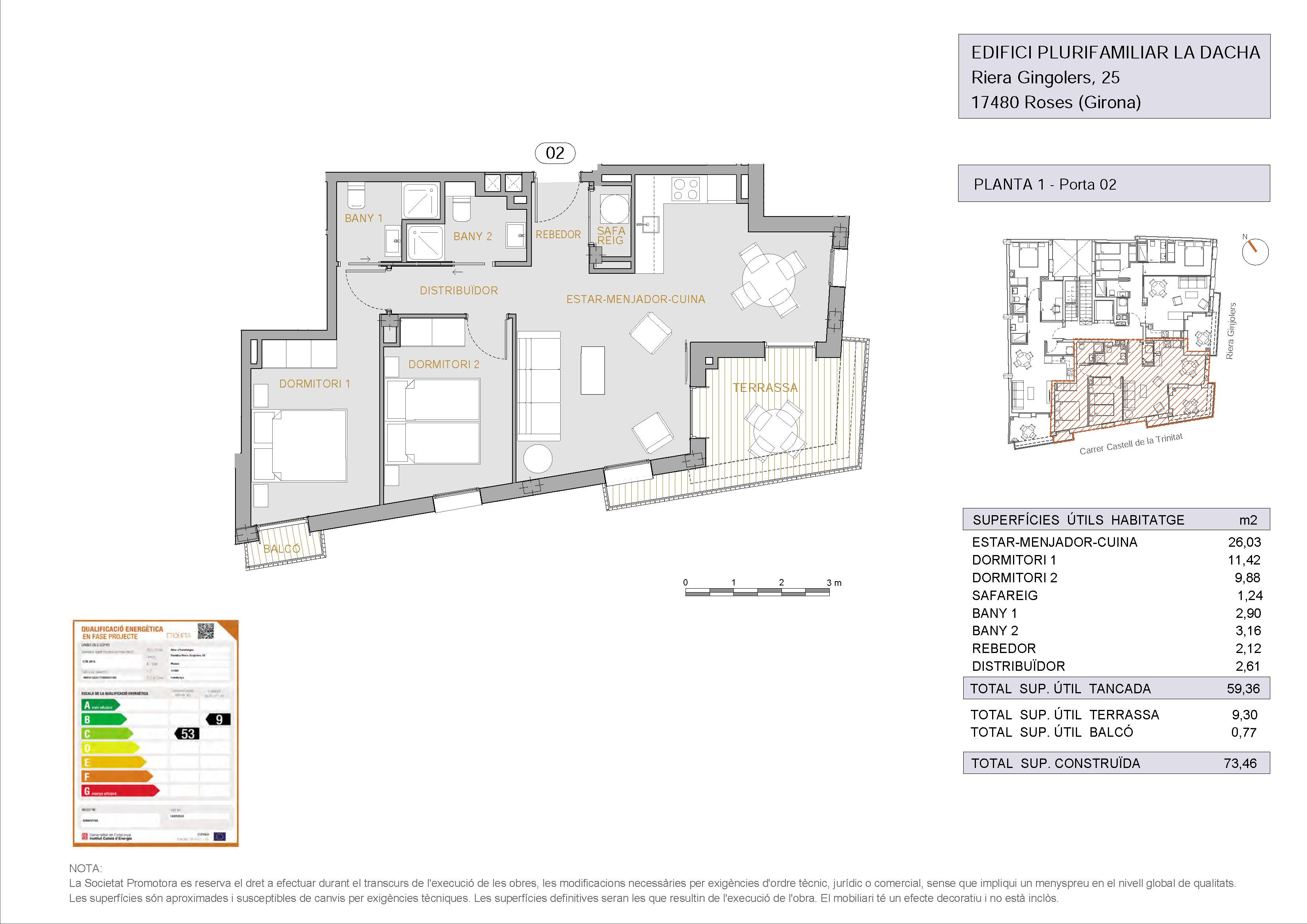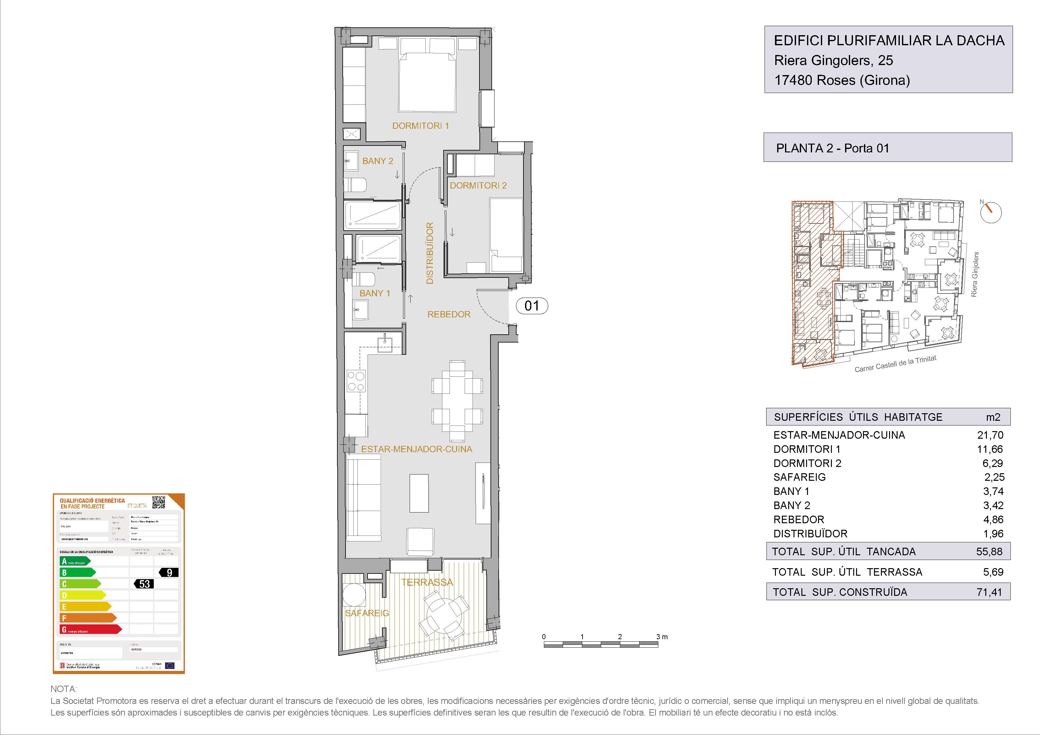 Les appartements ont une superficie construite de 70,23 m2 et disposent de 2 chambres, 2 salles de bain complètes, terrasse, buanderie et un grand salon, cuisine et salle à manger.